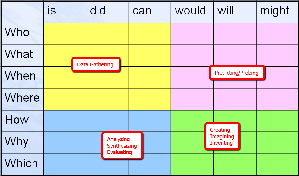 First, why don't other people question the way I do? Berger is right that toddlers ask an astonishing number of questions. I recently spent Christmas with my 3½ year old niece and took great joy in answering her questions, and trying to ask her even stranger questions than she asked me. Yet, Berger is also right that we stop questioning. My husband, who is not as much of a questioner as I am, is often both amused and annoyed when I continuously ask "well, what if X? What if Y?" We have had to come to an agreement that some things are, in fact, not possible, and that when he says so it is not always an invitation to figure out an alternative solution. The same pattern emerges with my students. When I would give them time to ask questions, I would very often get "I don't have any" as a response. One tool that was most helpful was a questioning chart my mentor teacher gave me during my first year of teaching. I printed it and hung it all around the room. When it was time to ask questions, I would prompt students to try to come up with at least one question from each category. Often, the questions were still a little forced but this tool did result in a marked improvement.