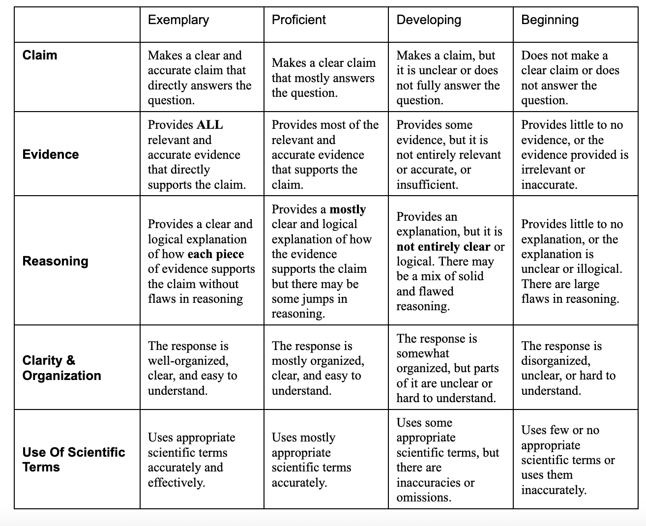 Some additional constraints I included in this assessment are allowing students choice in their method of response, inspired by UDL principles (specifically Consideration 5.1) (CAST, 2018). ELL students are permitted to write their responses in their best language, and all students have the choice of either writing or voice recording their response. Additionally, students can choose between a scaffolded CER format with separate spaces for the claim, evidence, and reasoning, or they can write a free style response. All responses are graded according to the same rubric. By being clear about what I expect: quality of scientific reasoning, appropriate use of evidence, and logical arguments, I am able to allow freedom in the way they demonstrate those competencies.